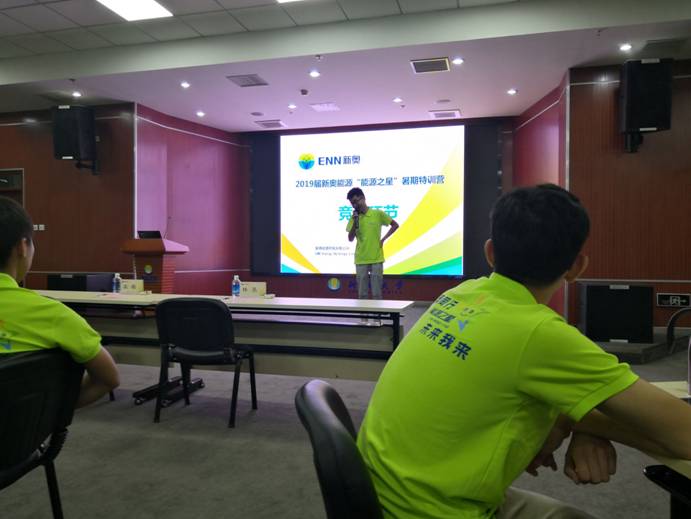 破冰活动开始,营员们首先集体观看了新奥能源集团宣传片,对新奥能源集团有了一个初步的了解和认知。然后负责人介绍了本次2019新奥“能源之星”特训营的意义并感谢项目组对此次活动的付出,之后对77名来自全国各大高校的营员们进行分组。每一组组内讨论竞选组长,生活委员,文体委员和学习纪律委员。小组讨论确定了自己的队名、口号、logo,并且制作了队旗。团队展示环节,实践队员许年所在小组的队旗创作得格外有新意,获得了训练营队员们的掌声。实践队员王金龙作为第二组组长参加特训营营长竞选,虽然竞选失败,但他表示,这次竞选的目的是为了让来自全国各高校的朋友们看到安工大人的活跃身影和卓越风采。能和来自全国各地其他高校的优秀同学在一起竞选营长是一种很好的机会和锻炼,自己会在接下来的几天带领队取得更好的成绩。