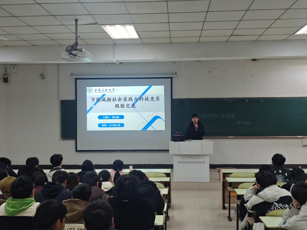 在阶教103教室开展节能减排社会实践与科技竞赛经验分享交流会。会议由学院团委副书记、2024级辅导员范浩东主持,2021级学生张心雨主讲,大一全体同学参与。