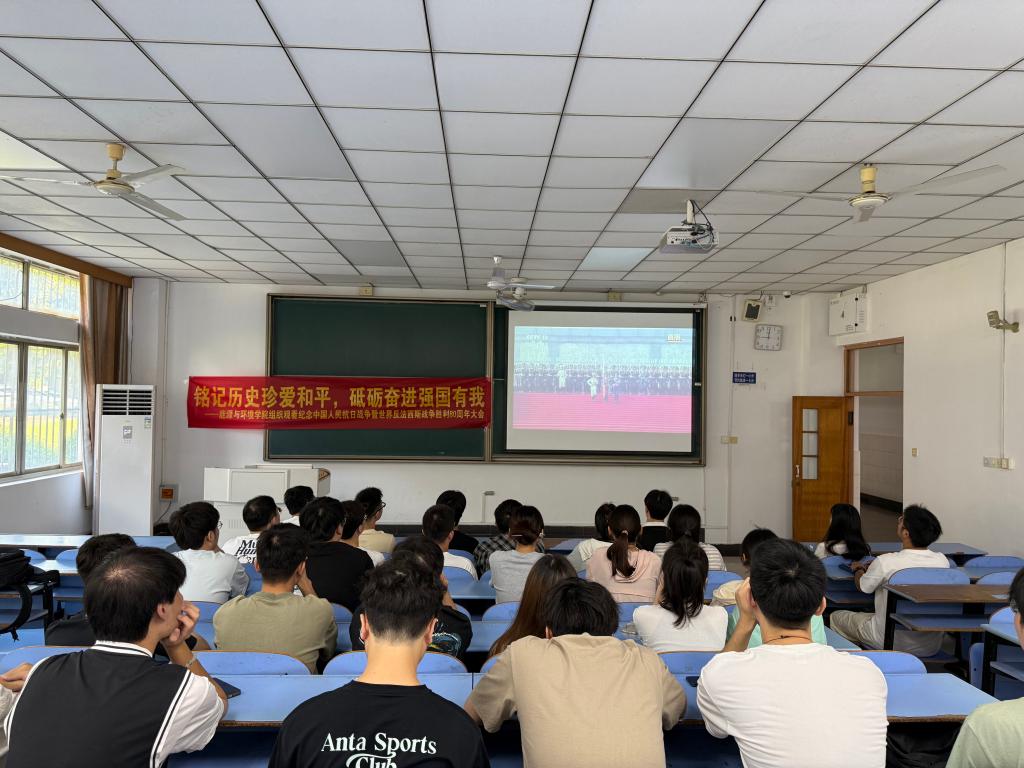在教三北119教室组织学生集中观看纪念中国人民抗日战争暨世界反法西斯战争胜利80周年大会现场直播。本次活动由学院习研会负责现场组织,近100名本科生和研究生代表到场参加了本次教育活动。教室悬挂的"铭记历史珍爱和平,砥砺奋进强国有我"的横幅格外醒目,表达了鉴黄师