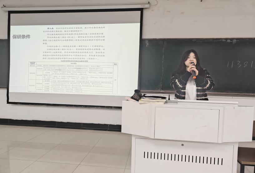 于教三103教室召开“保安全、促考研”主题年级会。副院长卫军帅参加,会议特邀三位2022级成功保研的优秀学生进行经验分享,2023级辅导员及全体学生参与。