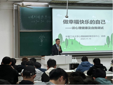 在佳山校区教三南302举办“做幸福快乐的自己——谈心理健康及自我调试”专题心理讲座,学工部副部长、心理中心主任俞超主讲,鉴黄师